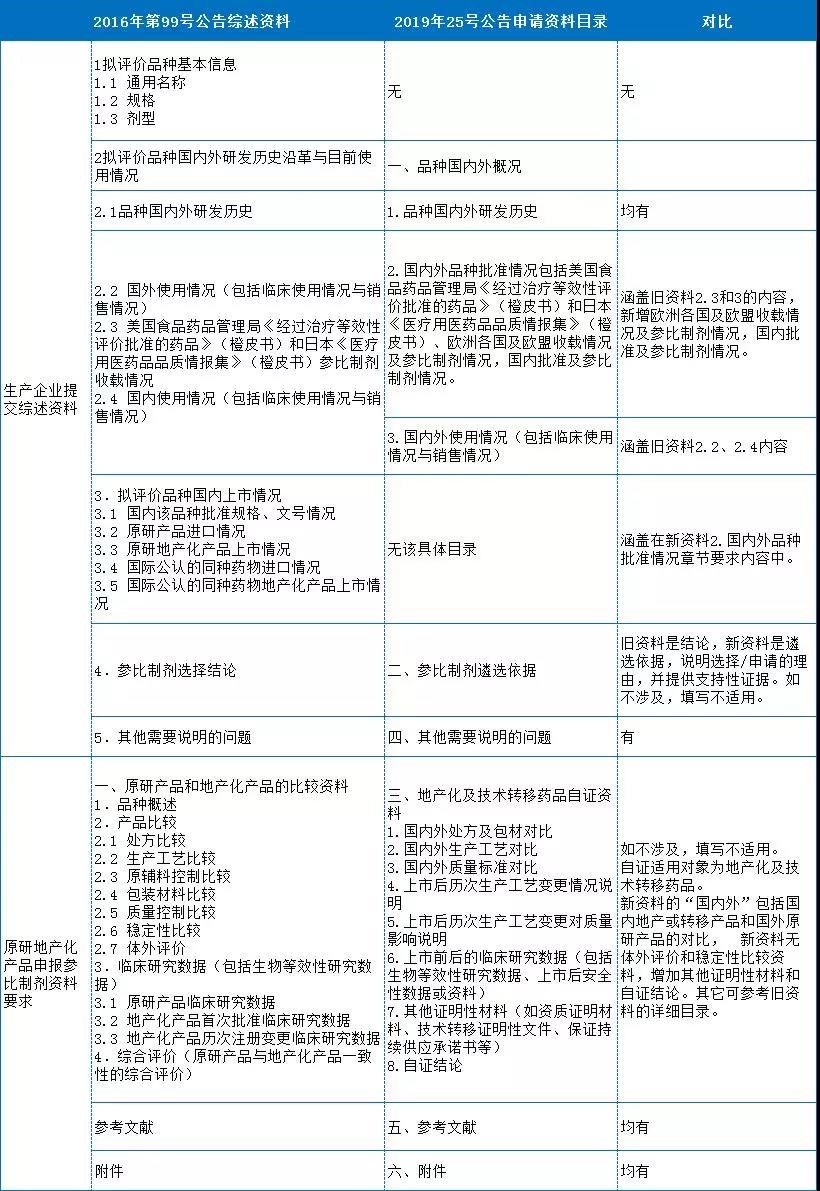 “2019年第25號”公告中的申請資料目錄更為精簡,適用對象包括生產(chǎn)企業(yè)、行業(yè)協(xié)會和自證企業(yè),主要區(qū)別在于國內(nèi)外品種批準情況和自證資料。在新公告中,國內(nèi)外品種批準情況包括國內(nèi)批準情況(可同舊資料3)和國內(nèi)參比制劑情況(新增,包括國家已公布和其它企業(yè)申報公示和藥監(jiān)局發(fā)布情況等),以及美國、日本橙皮書和歐洲各國收載及參比制劑情況(主要針對原研和國際公認同種藥物)。最新公告申請資料中的自證資料還含新增技術(shù)轉(zhuǎn)移藥品。